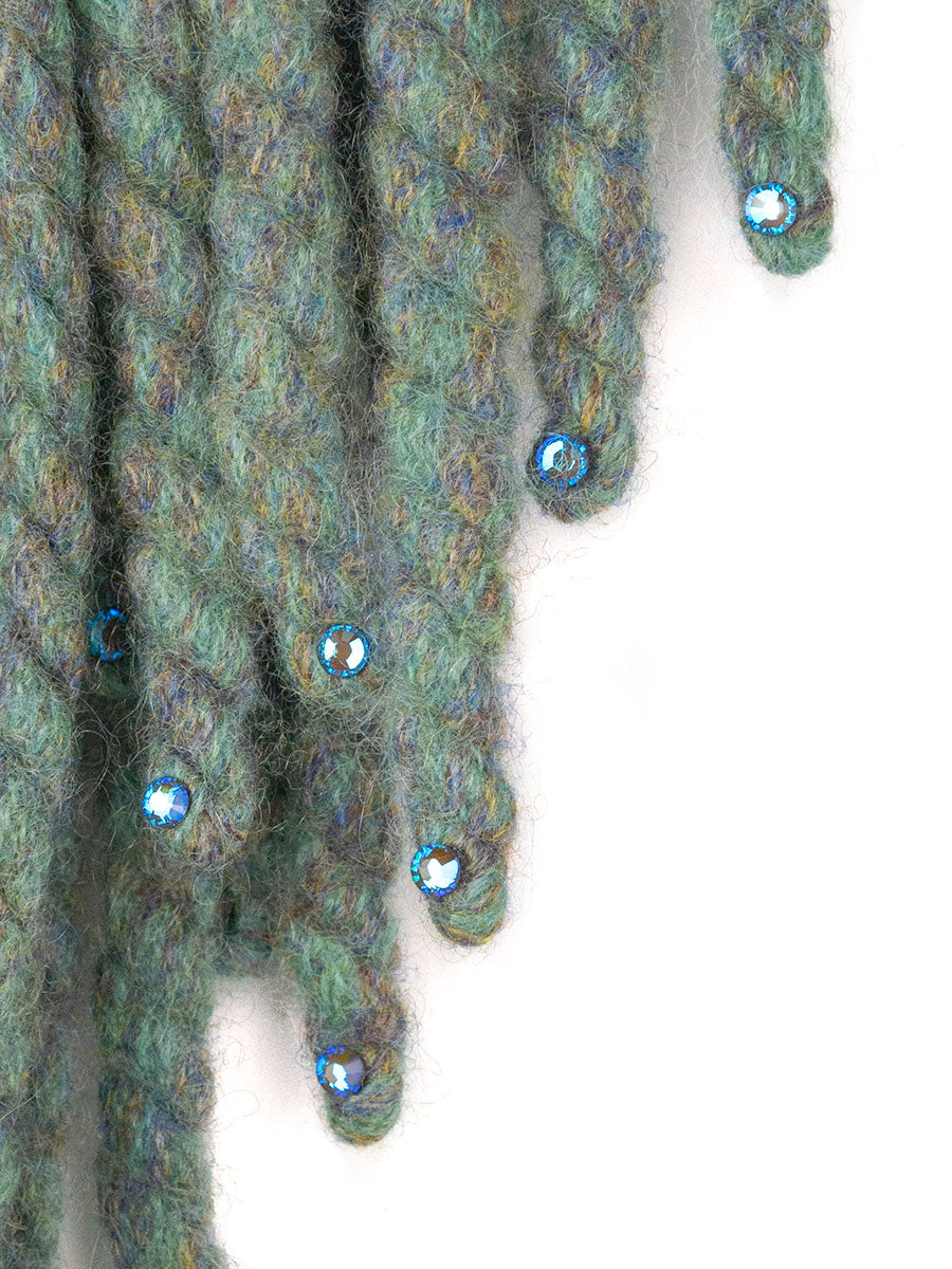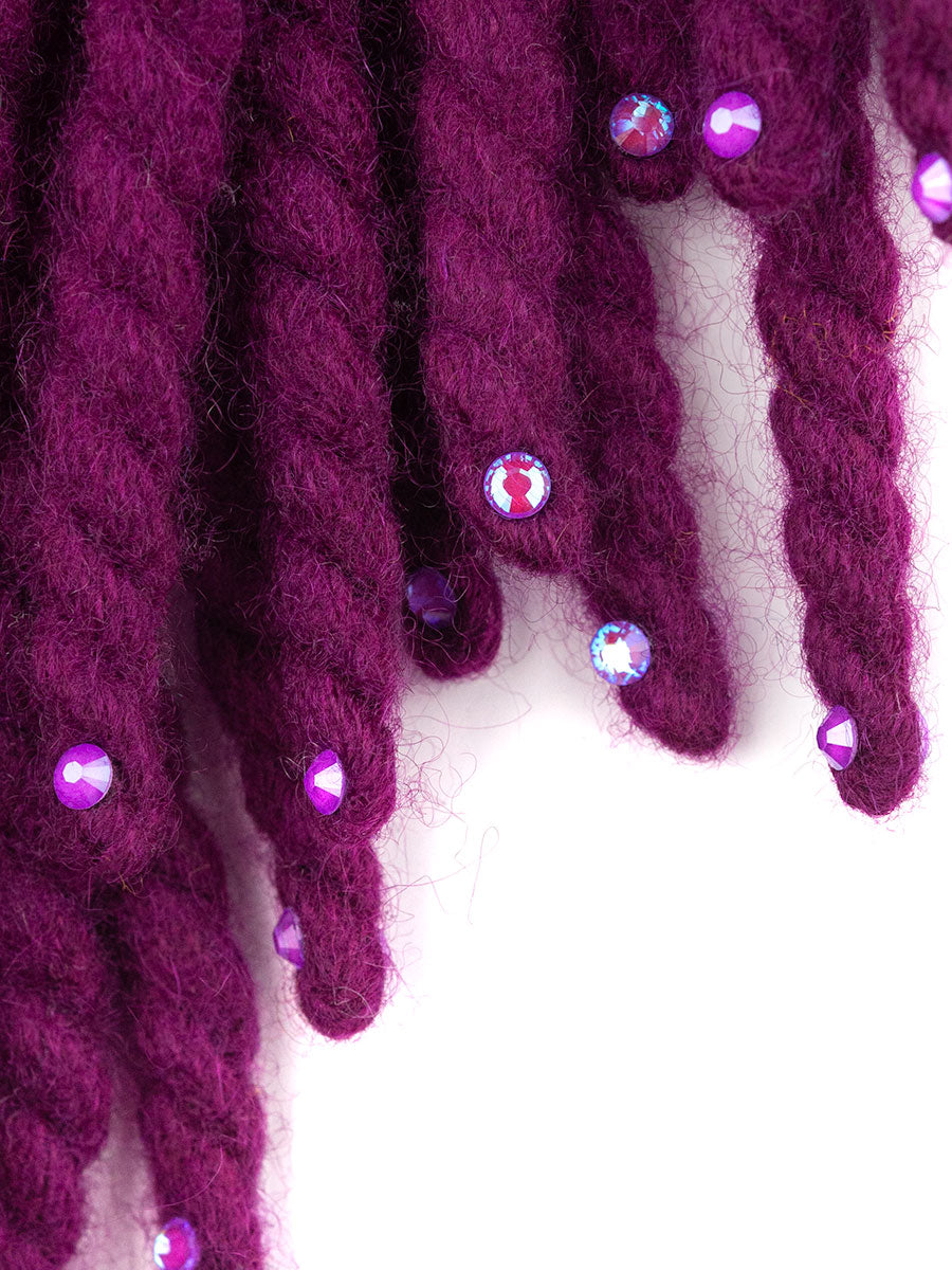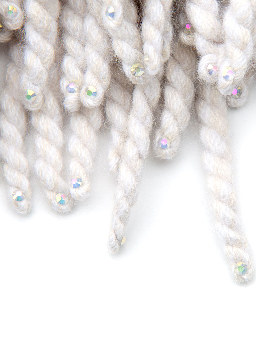 This delicious, everyday poncho has thick, buttery cabled fringe and a new "Constellation" all over embellishment with crystals. Each piece of fringe has two crystals on the ends of each piece.