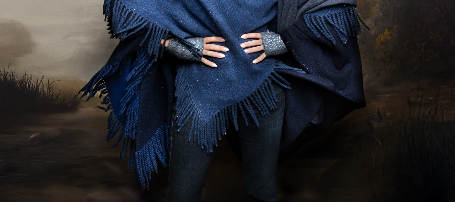 Make a statement with our luxurious crystal embellished cashmere ponchos. These pieces turn every head when you walk into a room! Hand loomed from the world's fairest Scottish cashmere yarn, hand sewn with our fabulous fringe plied and knitted directly into the ponchos. Throw them over yoga pants rushing out the door, or dress up for a black tie event.