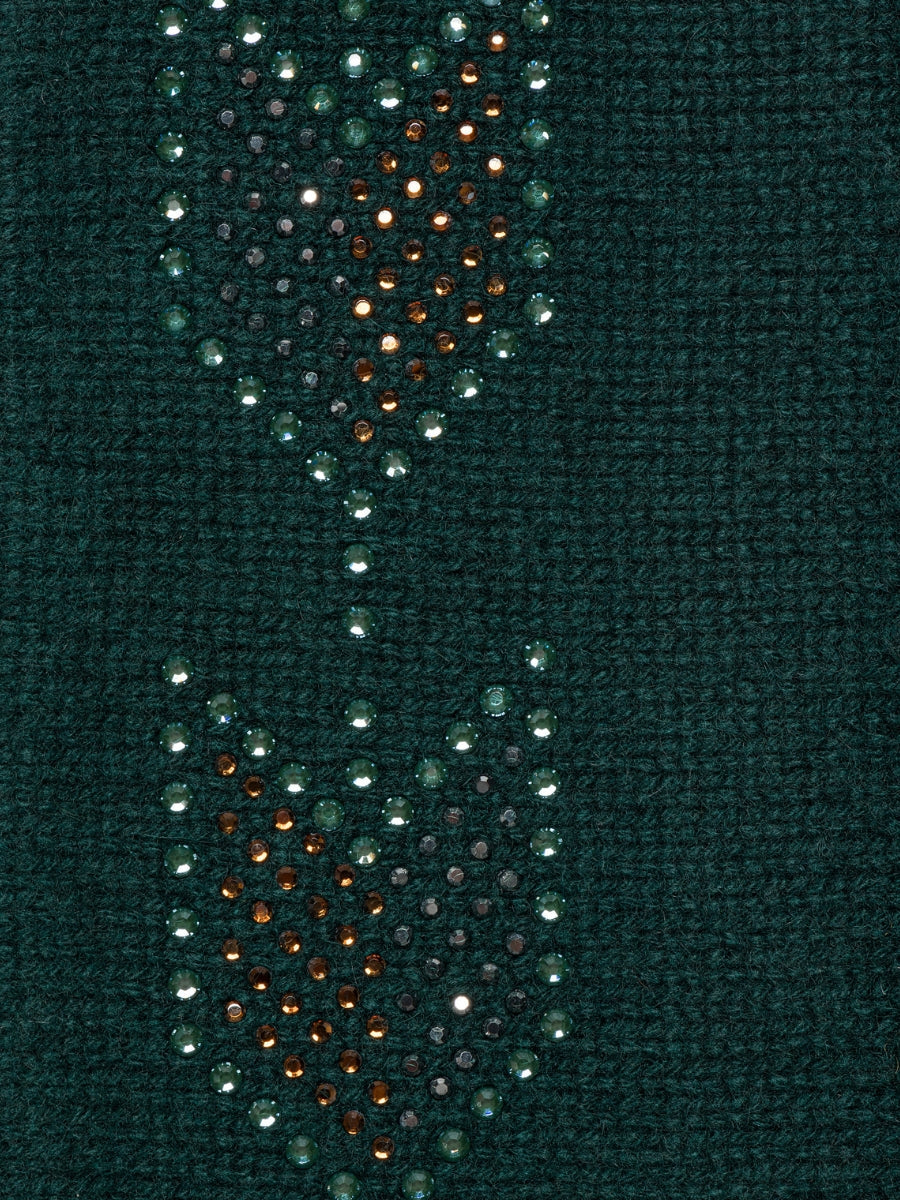 Our new mid length 3-ply Scottish cashmere fingerless gloves have a fantastic crystal Arrow design down the top of each glove created in three sizes and colors of small crystals. This design is inspired by the Japanese art of sashiko stitching, which is a folk art that originated in Japan about 425 years ago as a practical way to strengthen clothing. Our arrow design is a deconstructed piece of a traditional Yanabe (arrow feather) pattern using crystals instead of sewn stitches. Measures 8.5" in length.