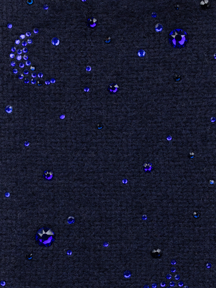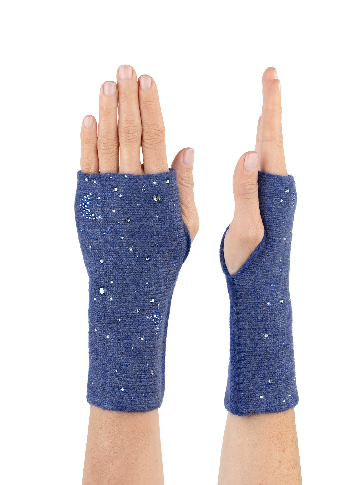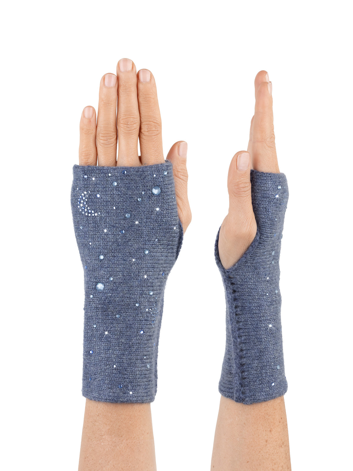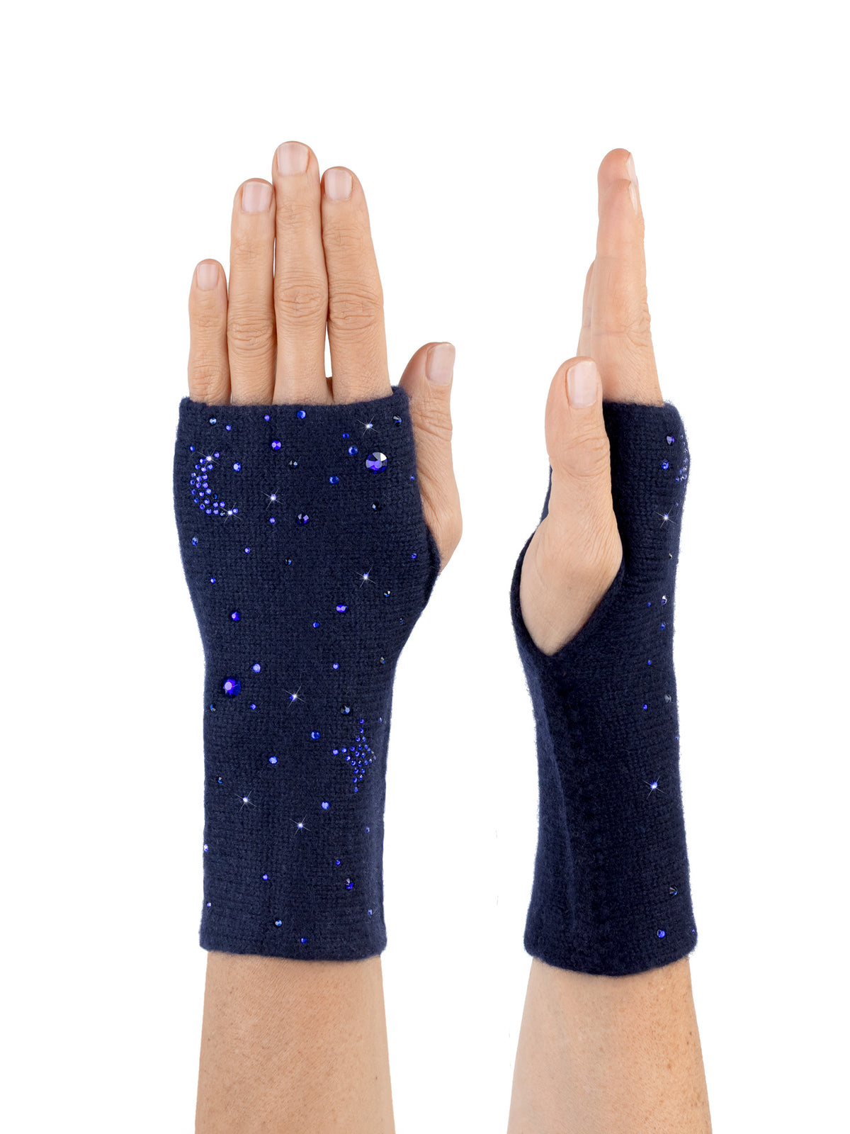 Our new cashmere 3 ply mid-length gloves are so cool! They are bejeweled with one moon on the left glove, three big stars, big crystal planets and a little of the cosmos! These beauties are absolutely fabulous and great for dressing up and for everyday. Measures 8" in length.
